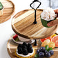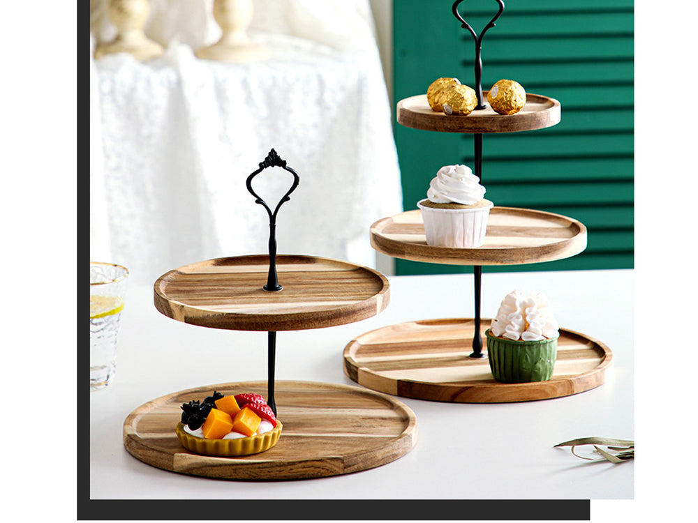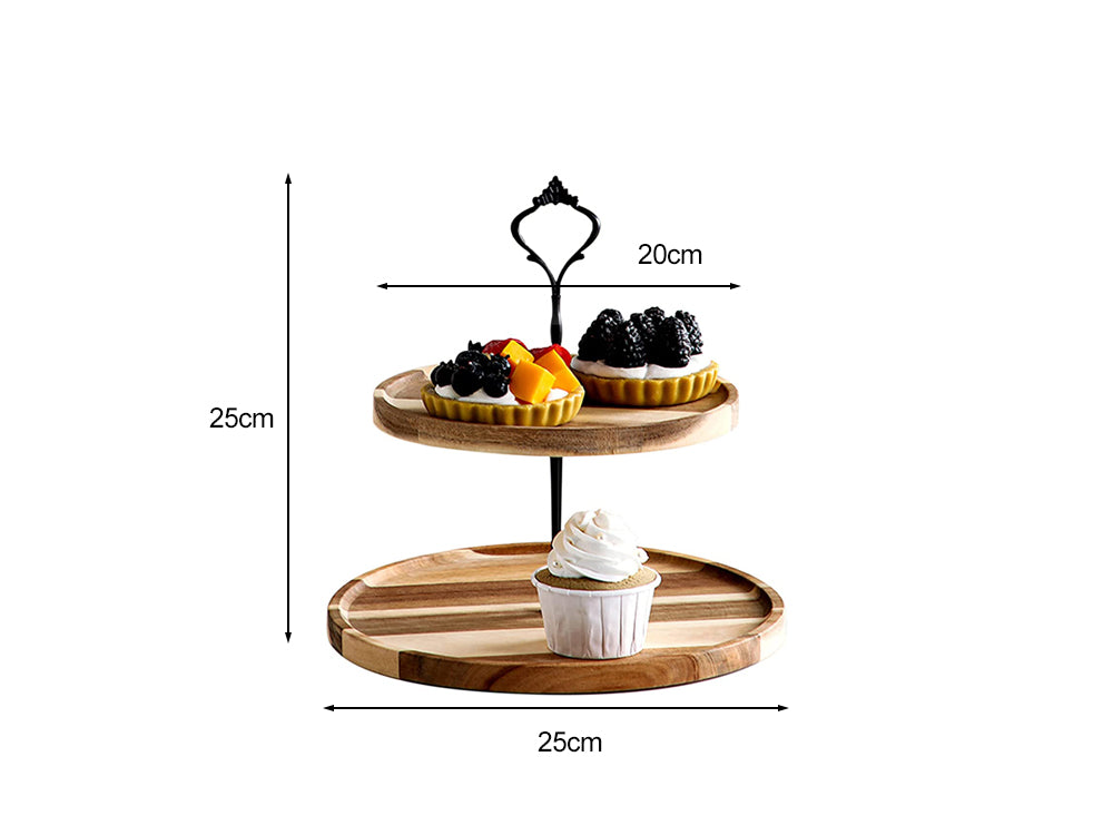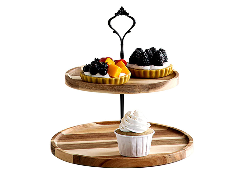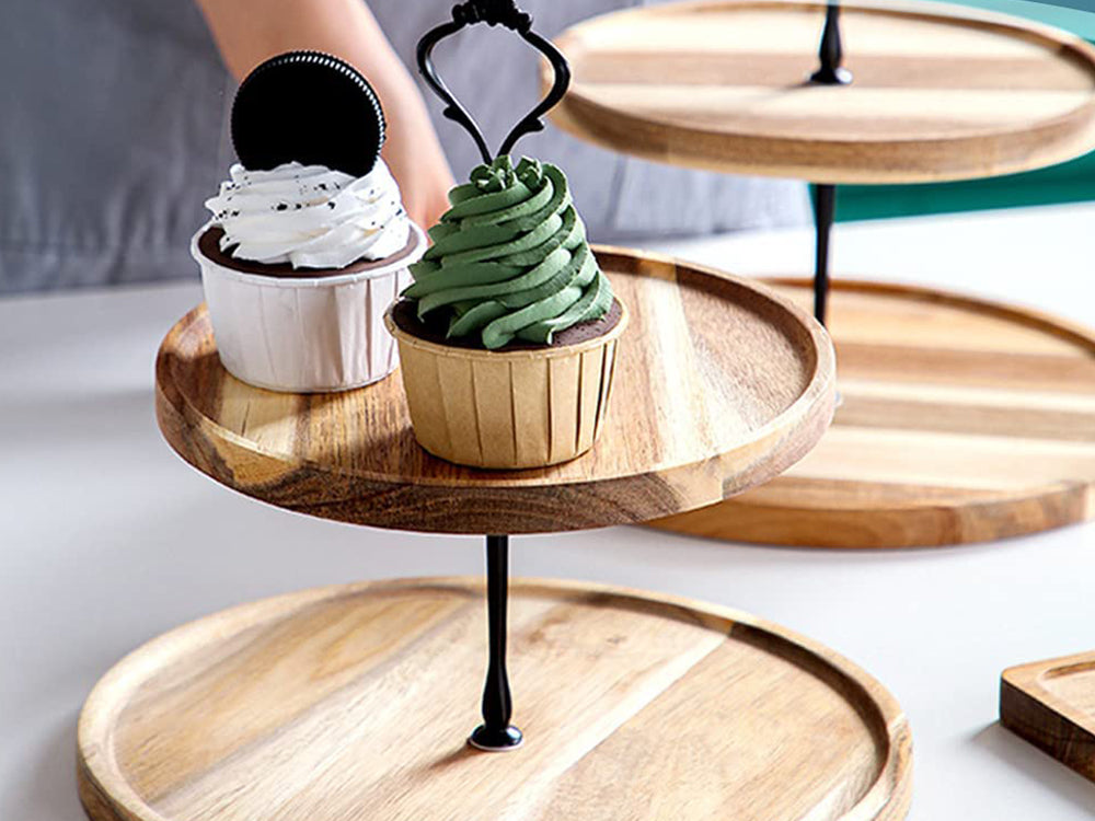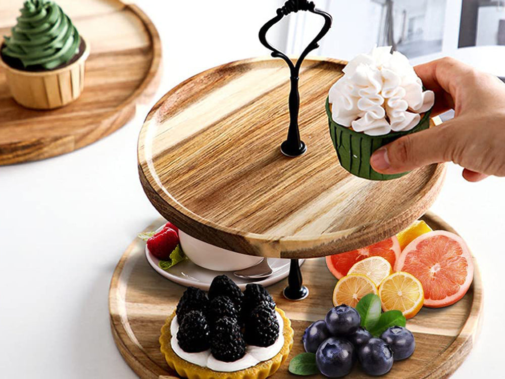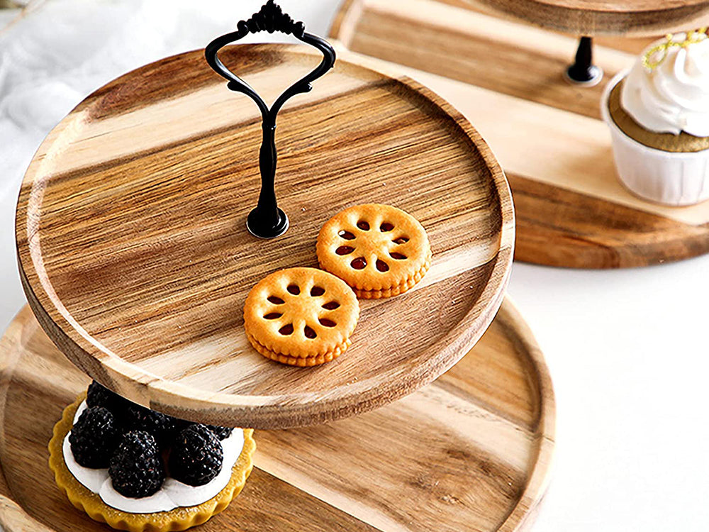 Elegant and Rustic: Add a touch of elegance and rustic charm to your kitchen with this stylish 2-tiered cupcake stand. The wooden plates are crafted from natural, paint-free acacia wood with visible wood grain and spliced through high pressure. The black metal handle is sleek and simple, while the tray's delicate texture and rich appearance make it a versatile match for any restaurant or decorative style.