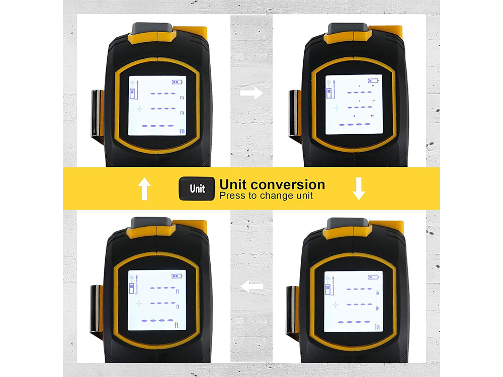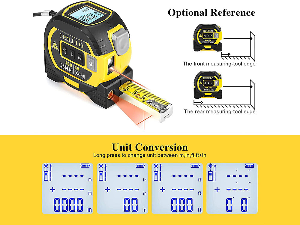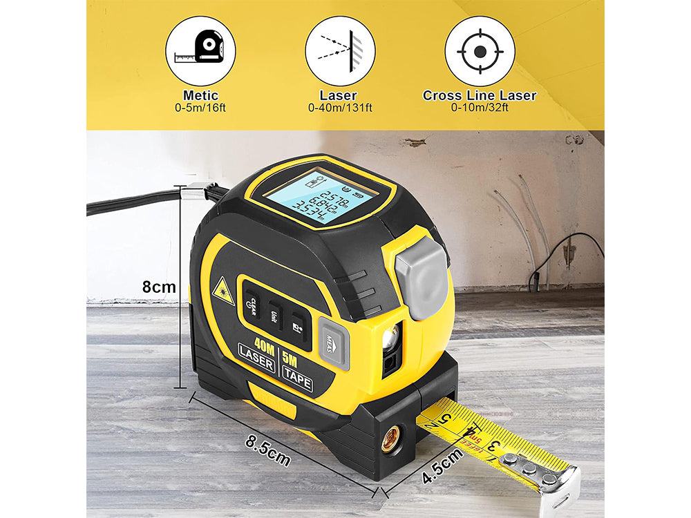 3-in-1 MEASURE: This laser tape measure includes three mode- 40m laser measure ,5m tape measure, and 10m 90° Cross Line Laser measure. Long press the "Unit" button of this laser measuring tape to switch units freely between M / In / Ft.