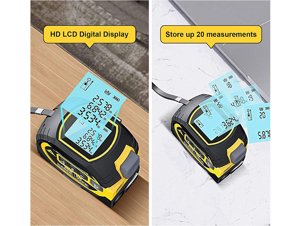 LED BACKLIGHT SCREEN & DATA STORAGE: Bigger LED-backlight screen helps you read laser ranging numbers clearly even in direct sunlight or dark environment; Store up to 20 measurements, laser tape measure auto-off to save energy.