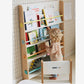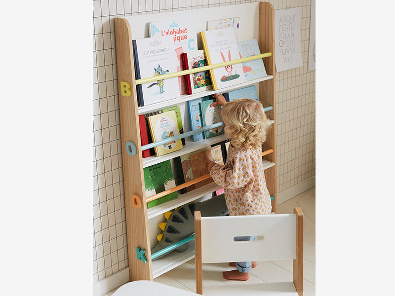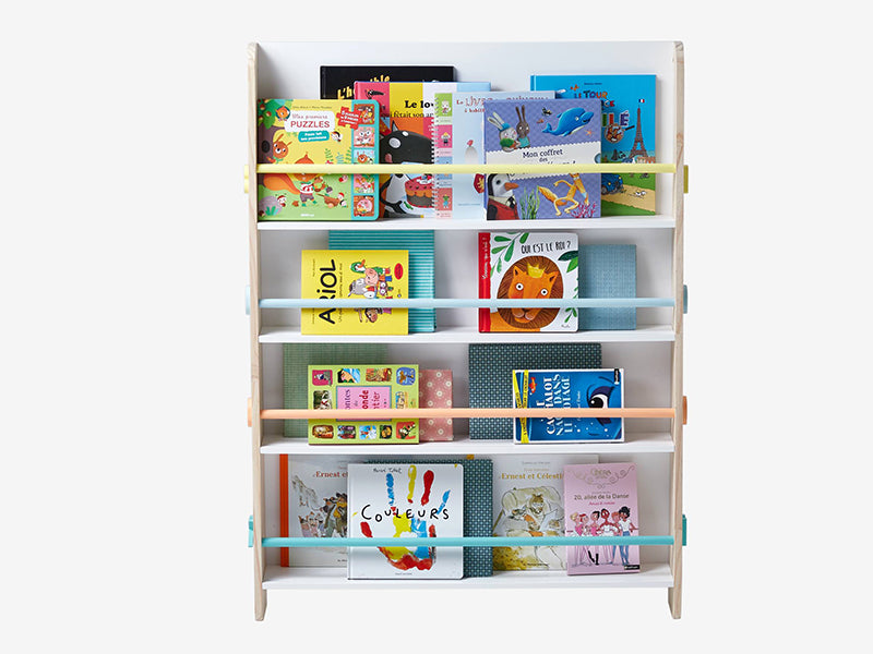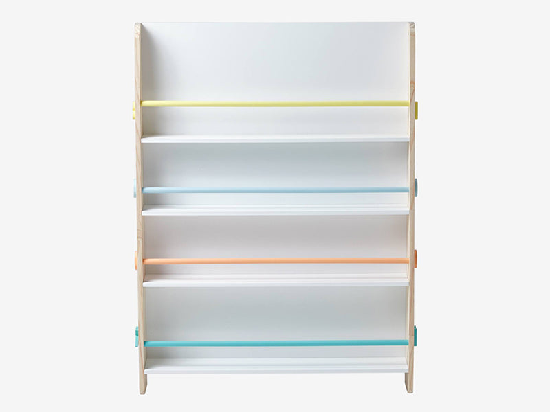 Practical Design: This simple yet practical bookcase is perfect for encouraging your kids to read books. The wooden poles prevent the books from falling and help kids easily identify and grab their books. The 4 shelves are color-coded and spell out the word "Book" on both sides.