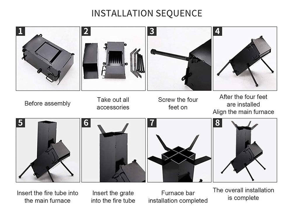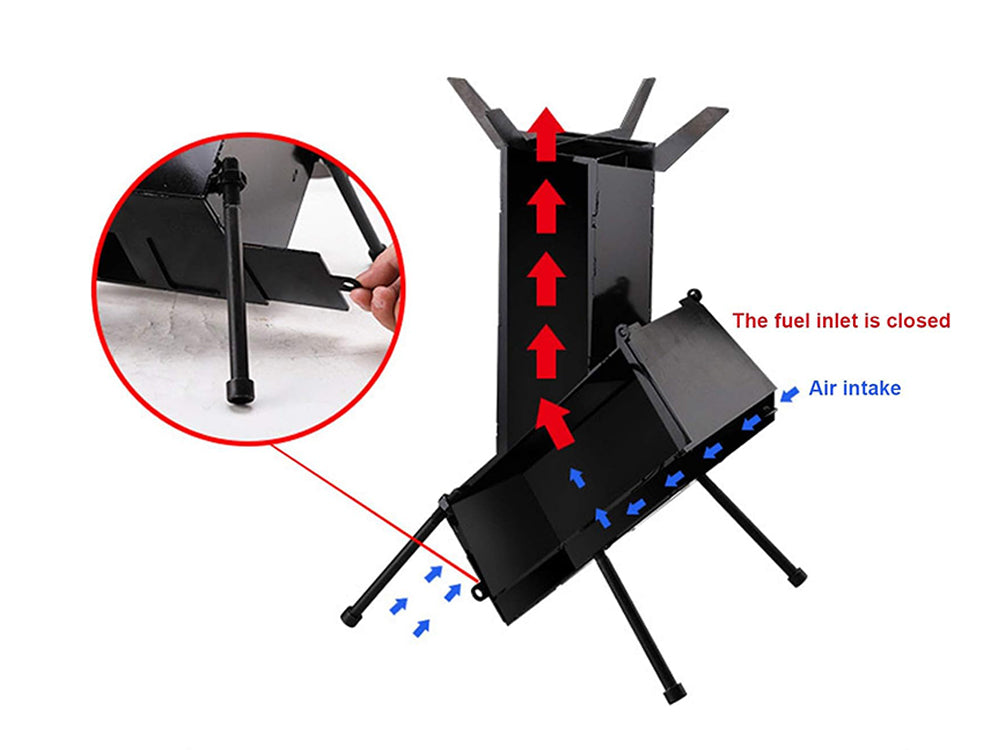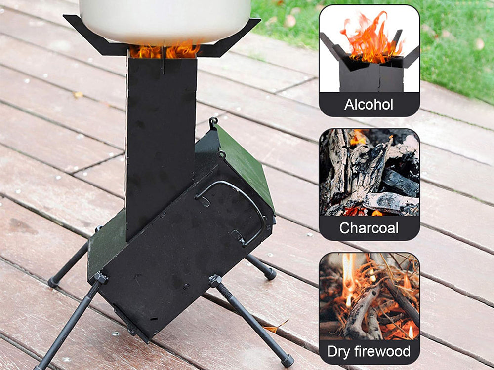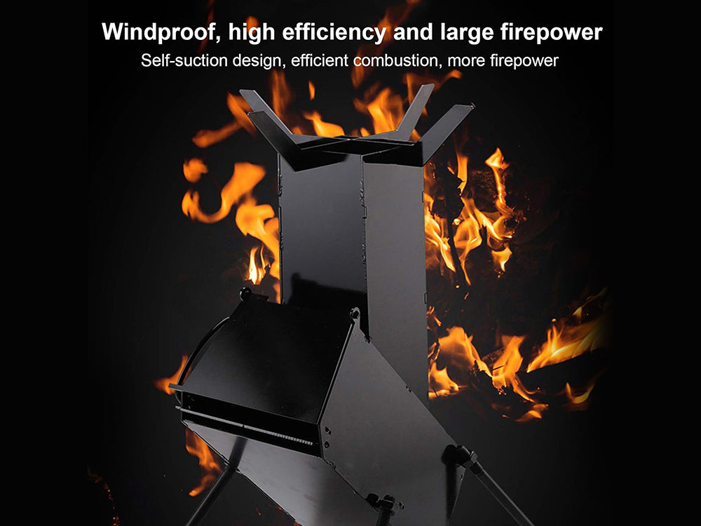 Functional Design: The rocket stove boasts a large fuel chamber, facilitating longer burn times and efficient heat transfer with minimal fumes emission.