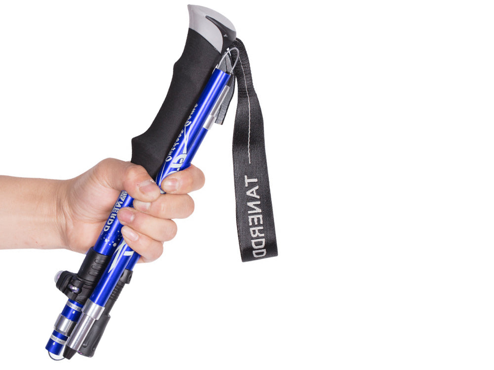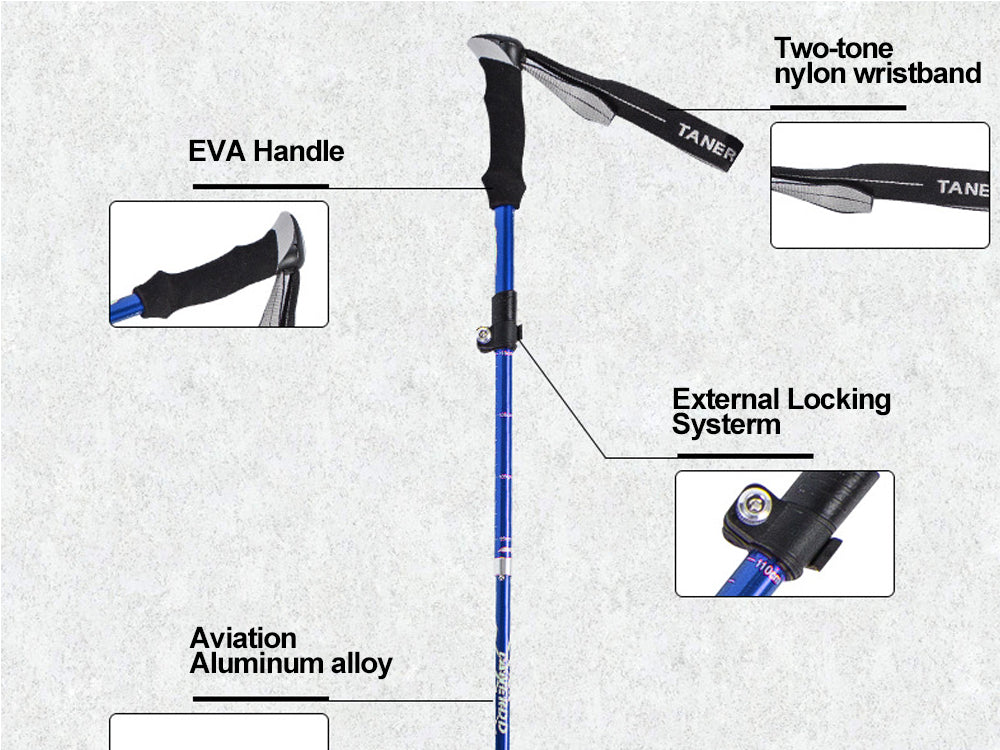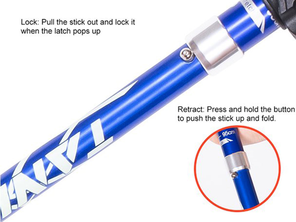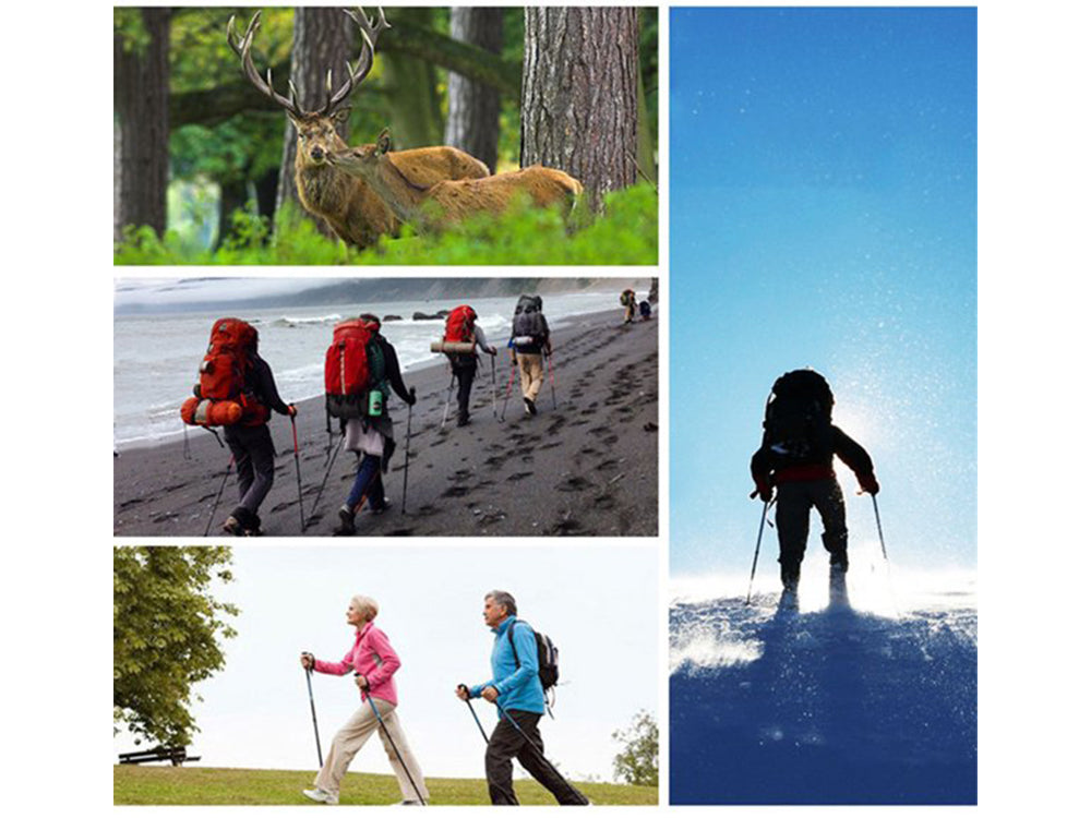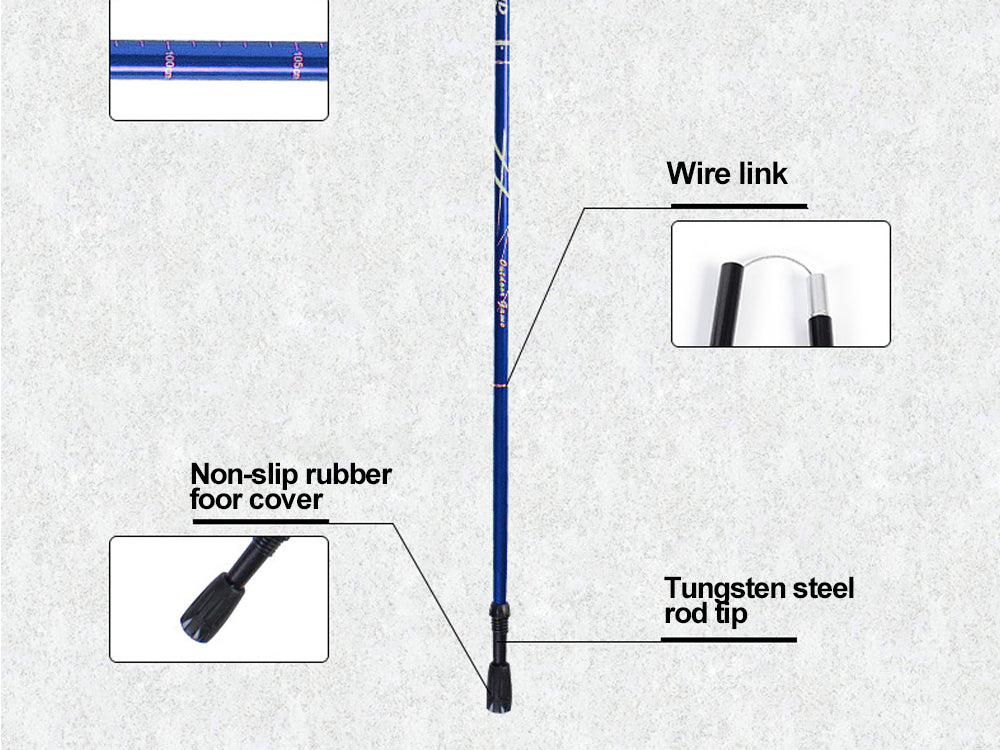 Introducing our new hiking companion, the "Ultra-Light Telescopic Hiking Stick". Made of aviation-grade 7075 aluminum alloy, this hiking stick is both strong and ultra-light, making it easy to carry with you on your outdoor adventures. The 5-section adjustable telescopic pole allows you to adjust the length of the hiking stick from approximately 95cm to 110cm, making it suitable for hikers of all heights. The anti-slip handle provides a comfortable grip, while the anti-shock spring mechanism reduces strains on hands and wrists. Additionally, the durable and adjustable wrist strap ensures a safer and more secure grip, and the tungsten steel tip with a removable rubber ferrule protects the hiking stick.